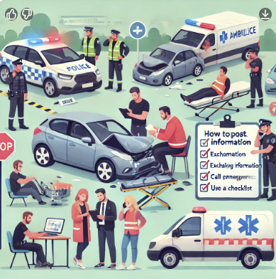 - 인명 피해 확인: 동승자, 상대 차량, 보행자 등 인명 피해 여부를 확인. 부상자가 있다면 119에 먼저 신고합니다.